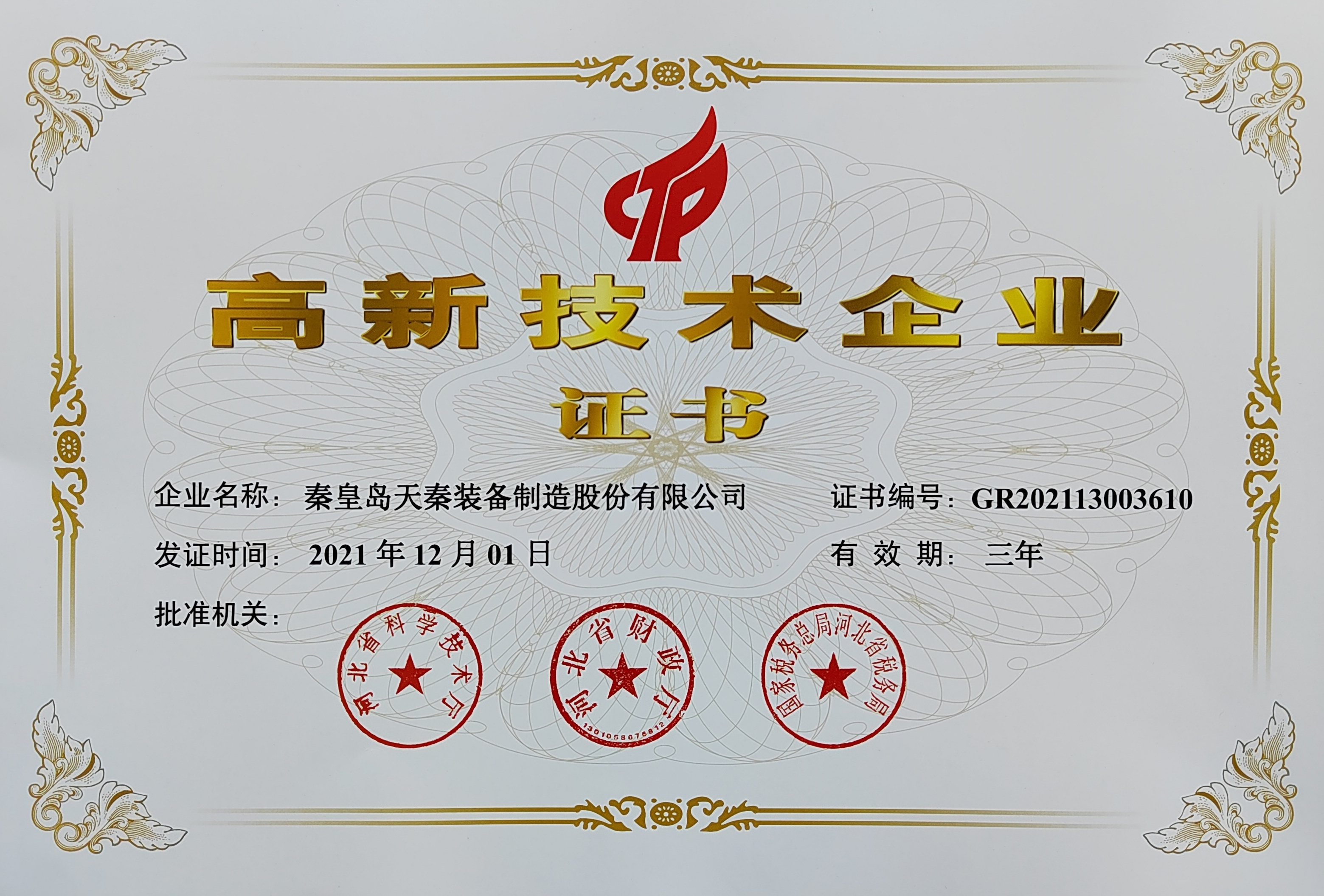- 秦皇島天秦裝備制造股份有限公司創(chuàng)立于1996年,總部位于河北省秦皇島市經濟技術開發(fā)區,秦皇島廠區占地4萬平方米,擁有3萬平方米的標準廠房、辦公樓和工程技術研發(fā)中心;分部天津廠區位于天津市靜海經濟開發(fā)區,占地2萬平方米,擁有1.6萬平方米標準廠房。 公司通過了GB/T 19001質量管理體系及GB/T 24001環(huán)境管理體系認證,是國家高新技術企業(yè)、河北省軍民融合產學研用創(chuàng)建基地,建有省級院士工作站。